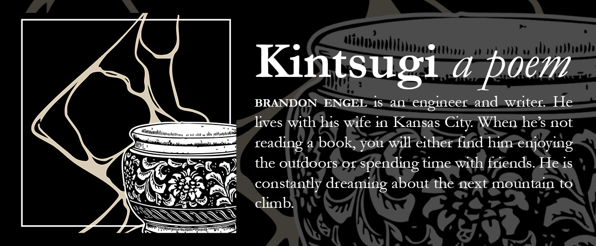 BRANDON: This poem was inspired by multiple Bible verses (Psalm 31:12, Isaiah 64:8, 2 Corinthians 4:7, Psalm 23:5, Romans 9:21) that blend metaphors of humanity as vessels at stages of the redemptive process as told through the eyes of the Kintsugi artform.