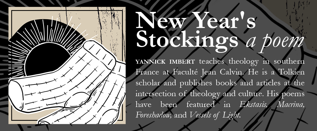 YANNICK: This poem has been long coming. It should have been a “rentrée” piece: rentrée is French for the beginning of the school year. Coming back from the seminary’s library where she worked she looked at the chimney with her beautiful bright eyes and asked me where her “stockings” were. I was lost. Stockings are for Christmas. That's when they’re due! Not before. I thought about it. Yes, they are due for Christmas—so to speak. But if we're only giving was is due, what does it say about us? About what we value? It took a few months, but I gave my wife “not-Christmas-stockings”... it just took a few months. It was a good reminder that we live not only by what we think is due, or normal. And that is grace! Grace given, and divine grace received.