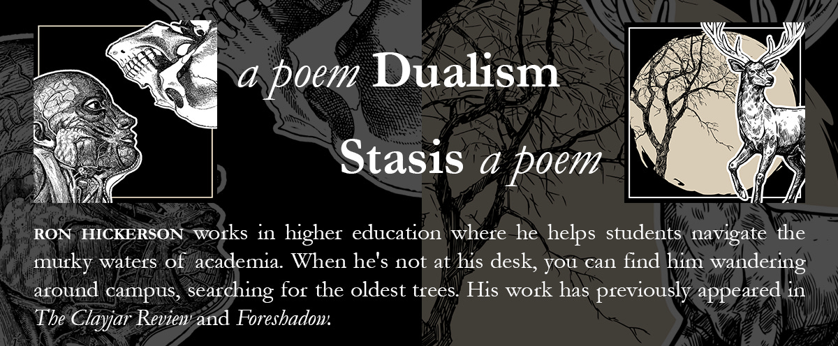 RON: Stasis | I was inspired to write Stasis during a stressful time at work when I was promoted to a new position which came with a lot of unexpected responsibilities and unforeseen conflict, which led to a lot of walks where I would reflect on my job and my anxieties amid the old oak trees.